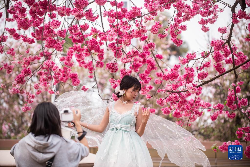 近日,云南昆明圓通山公園的櫻花進入盛花期,吸引大批游客前來觀賞。