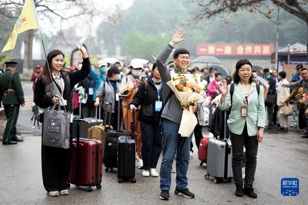 3月15日,在越南諒山省的友誼國際口岸,中國游客向越方工作人員揮手致意。