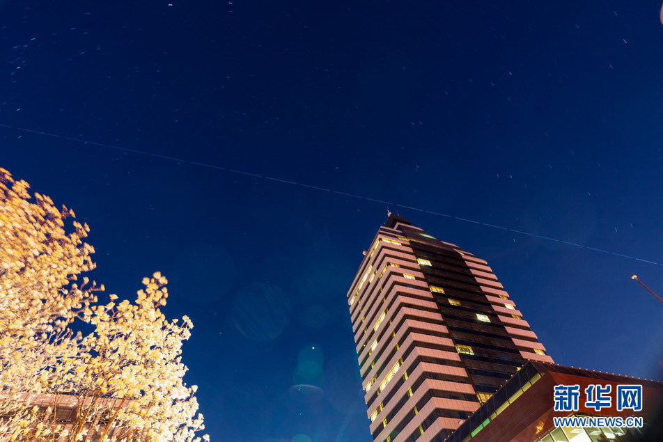 ????3月15日晚,中國空間站過境北京上空。在玉蘭花的芬芳之中,中國空間站在新華社新聞大廈上空劃過,畫出一道漂亮的弧線(延時攝影堆棧合成)。新華網 鐘奕 攝