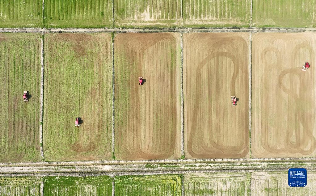在江西省南昌縣大田農社,農民駕駛農機在稻田里耕作(3月15日攝,無人機照片)。