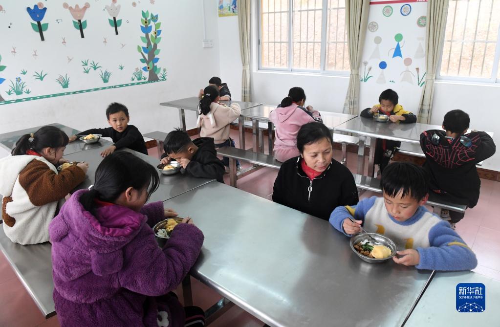 廣西金秀瑤族自治縣忠良鄉山界教學點的教師陶鳳英陪學生吃午飯(3月15日攝)。