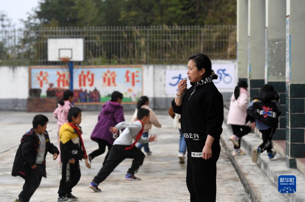 廣西金秀瑤族自治縣忠良鄉山界教學點的教師陶鳳英吹哨子催促學生進教室上課(3月15日攝)。