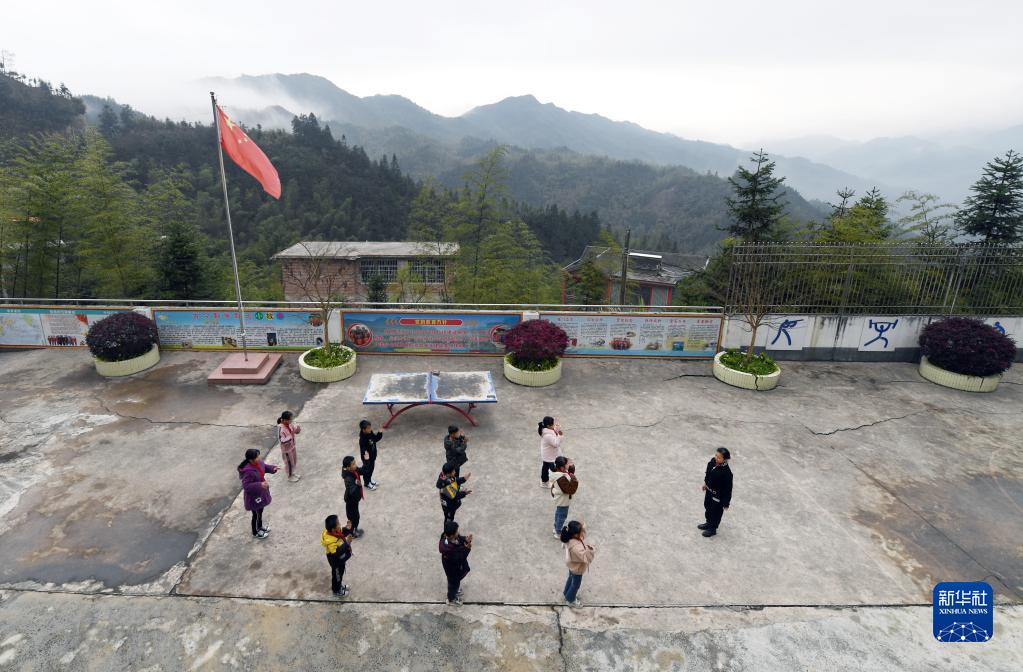 廣西金秀瑤族自治縣忠良鄉山界教學點的教師陶鳳英和學生一起做課間操(3月15日攝)。