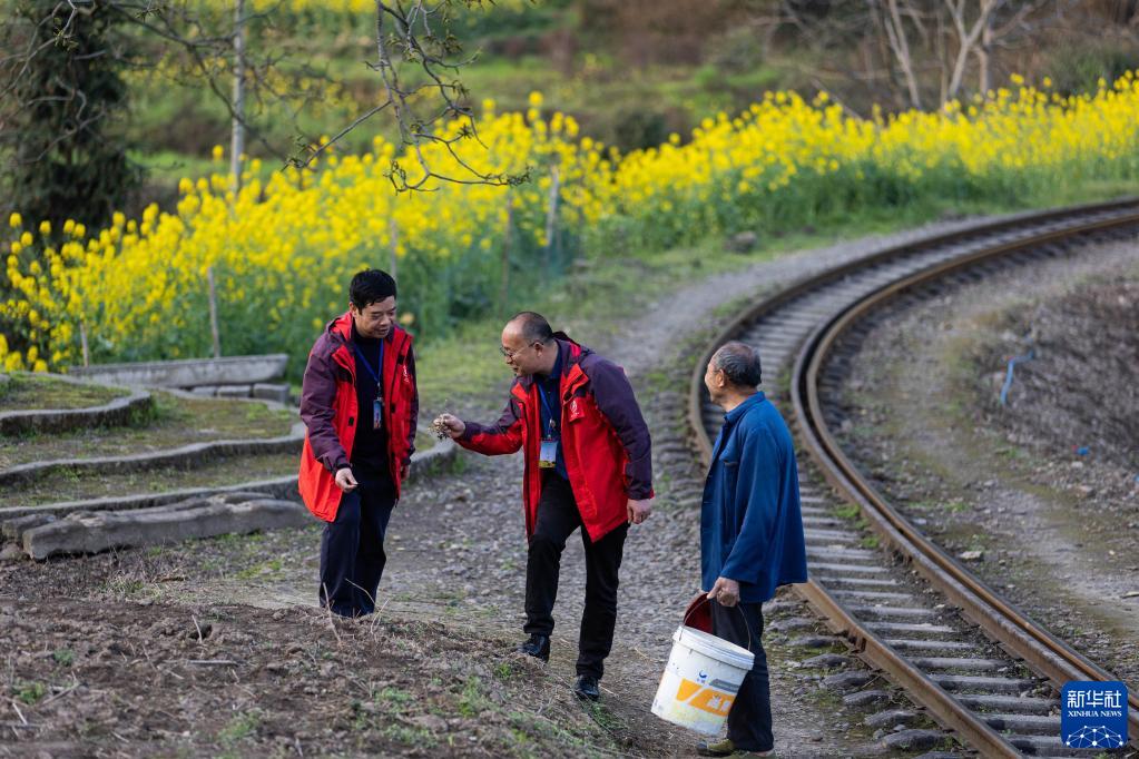 3月14日,在菜子壩站,“張火癡”(左)和負責小火車運營管理的同事鄧強(中)、當地村民討論嘉陽小火車鐵路沿線種植花卉的事情。