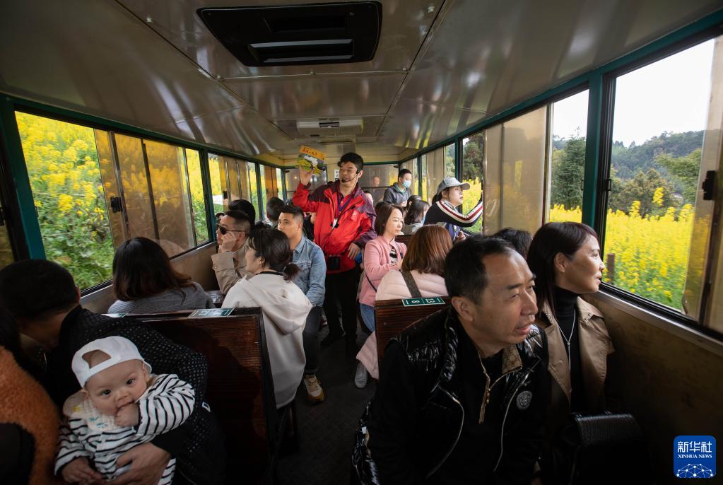 3月15日,“張火癡”(中)在嘉陽小火車上為游客講解。他曾是嘉陽小火車金牌講解員。