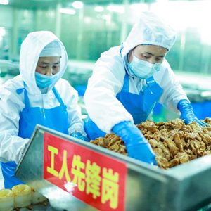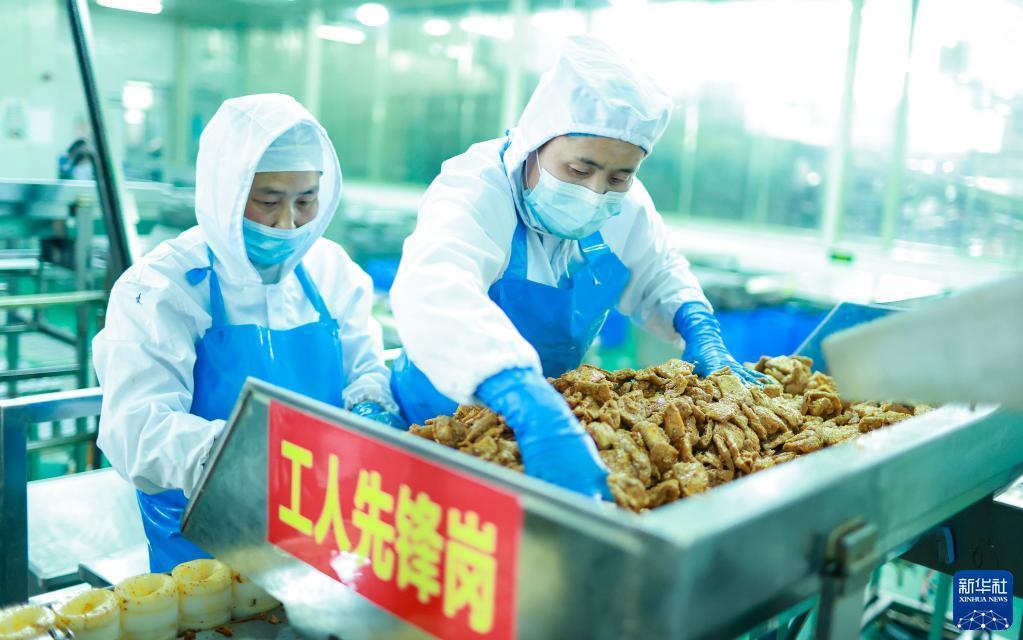3月15日,山東省臨沂市蘭山區半程鎮,沙汀峪村村民孫宗英(右)和工友在當地一大豆蛋白生產企業車間工作。