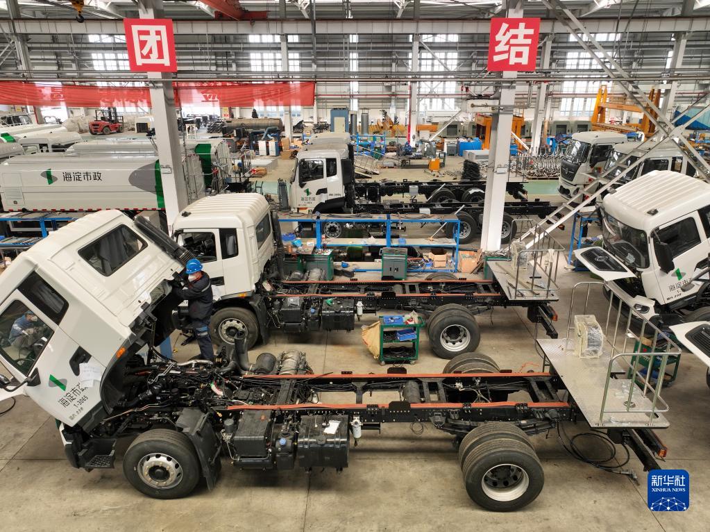 3月15日,在位于樂亭經濟開發區的北京環衛集團環衛裝備樂亭有限公司,工人在車間內工作(無人機照片)。