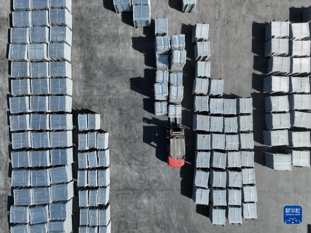 3月15日,在位于樂亭經濟開發區的華北易安德腳手架制造有限公司,叉車在搬運產品(無人機照片)。