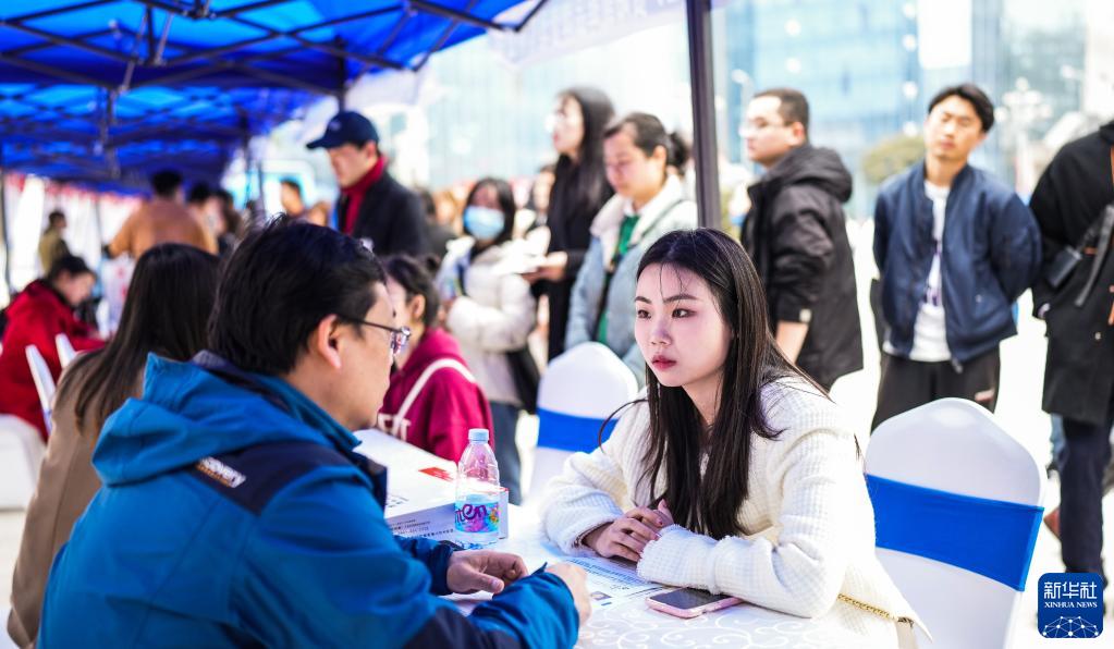 3月16日,求職者(右)在貴陽市的招聘會現場與企業人員交流。