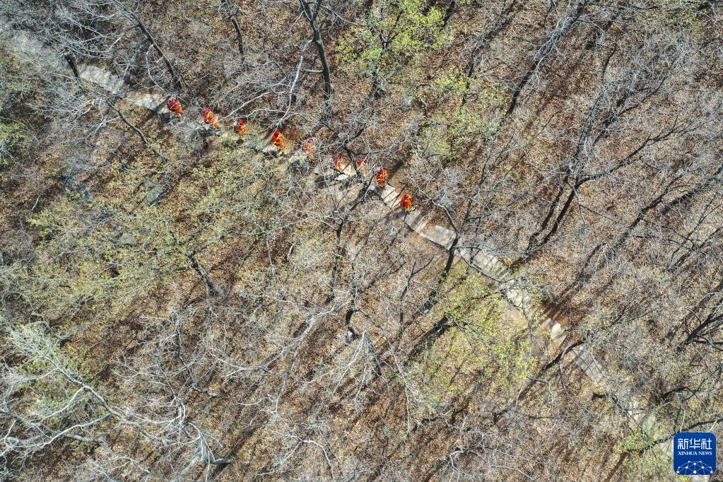 3月15日,長清區國有蓮臺山林場防火中隊隊員在林區巡護(無人機照片)。