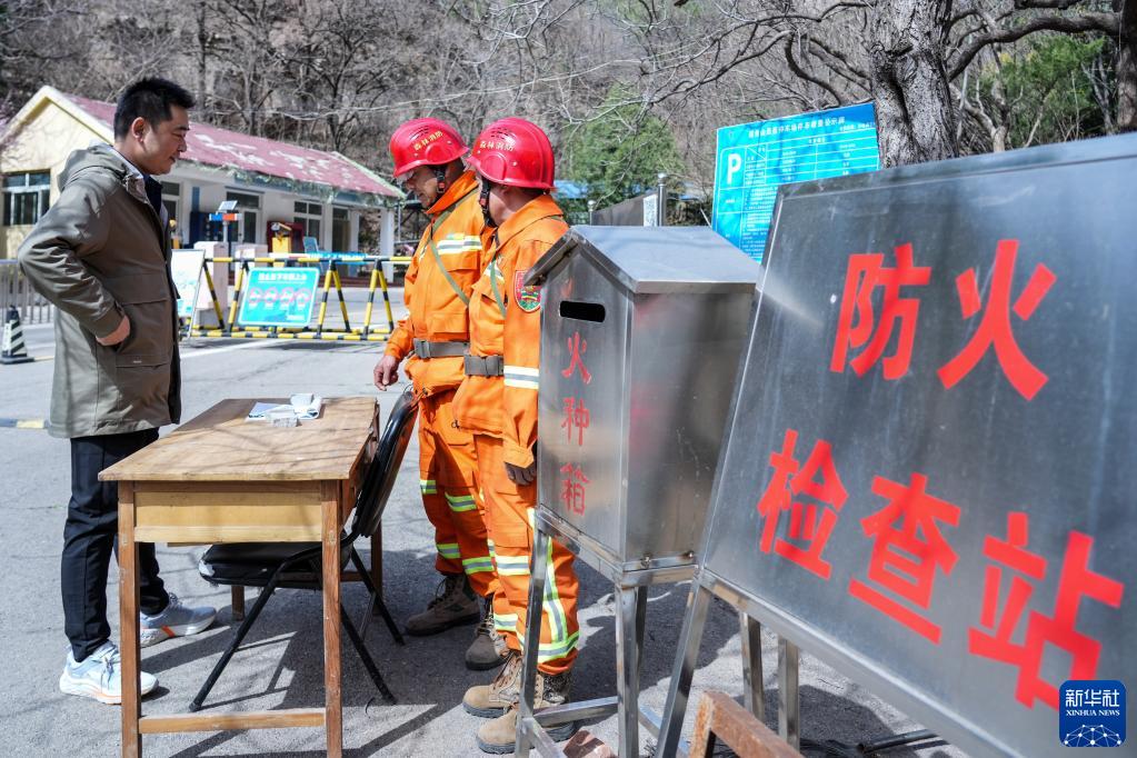 3月15日,長清區國有蓮臺山林場防火中隊隊員在林區入口檢查火源。