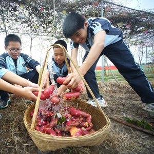 3月16日,孩子們在廣西南寧市江南區蘇圩鎮紅薯地旁洗紅薯。