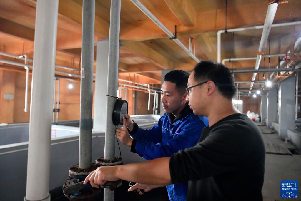 3月16日,在位于天津市濱海新區現代農業產業園的天津海升水產養殖有限公司育苗車間,工作人員查看車間環境溫度等信息。
