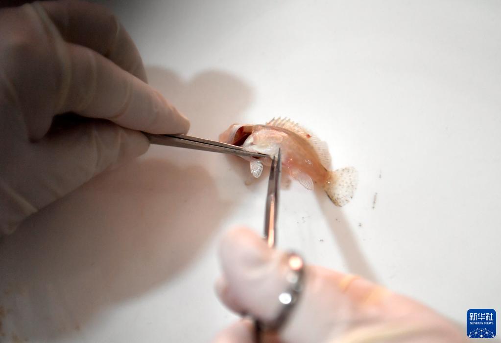 3月16日,在位于天津市濱海新區現代農業產業園的天津立達海水資源開發有限公司實驗室,工作人員在解剖石斑魚魚苗。