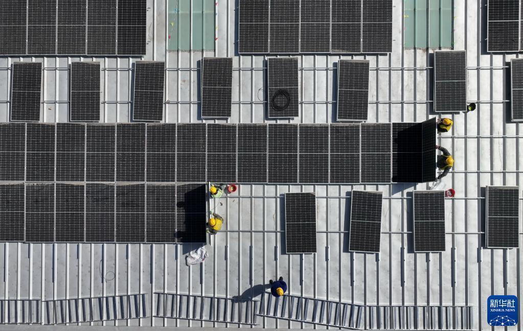 3月16日,工人在唐山市蘆臺經濟開發區一家企業廠房屋頂上安裝太陽能光伏發電板(無人機照片)。