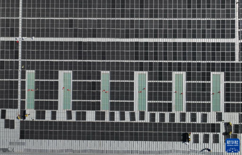 3月16日,工人在唐山市蘆臺經濟開發區一家企業廠房屋頂上安裝太陽能光伏發電板(無人機照片)。