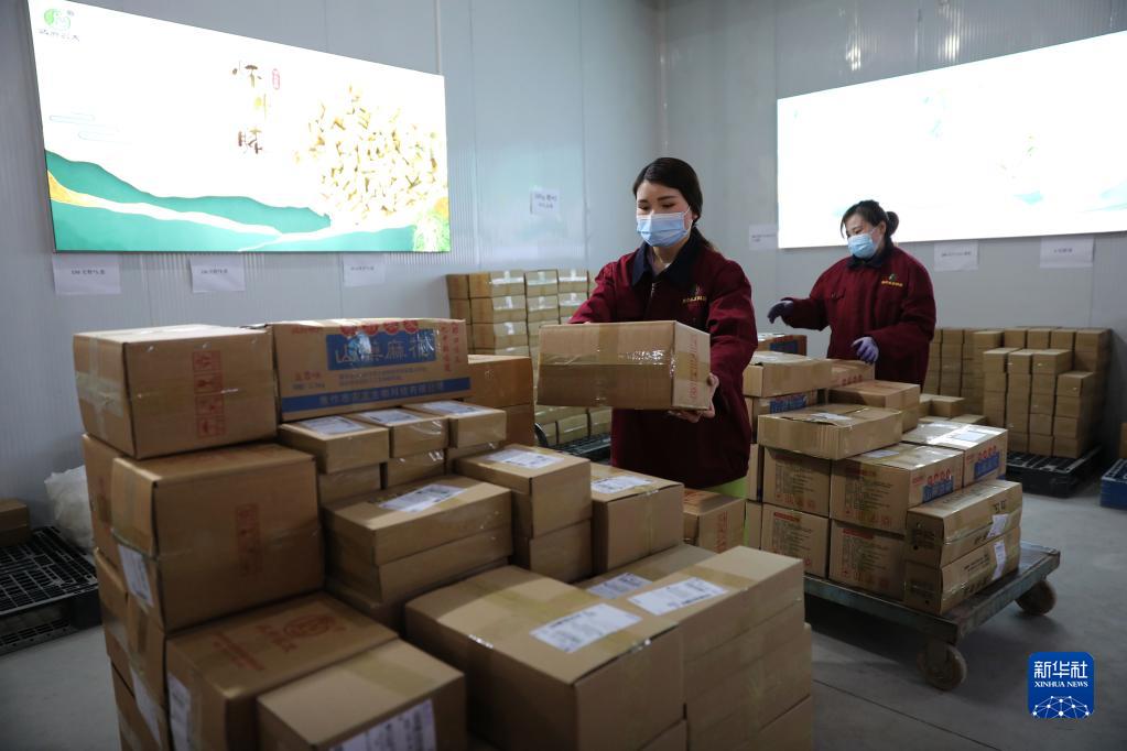 3月16日,在河南省武陟縣農友種植專業合作社,工人打包好準備快遞的山藥產品。