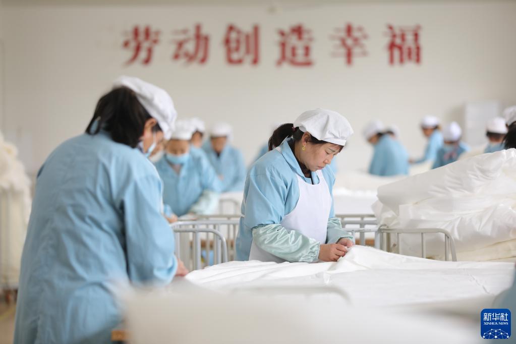 3月16日,在蘇州太湖雪絲綢股份有限公司生產車間內,工人在拉制蠶絲被。
