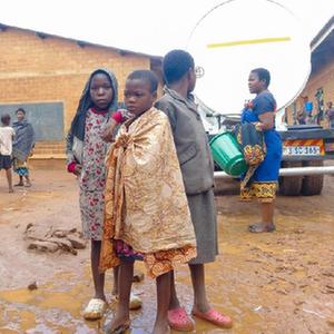 3月16日,在馬拉維布蘭太爾,一些災民兒童在一所小學內的臨時安置營地領取早餐。