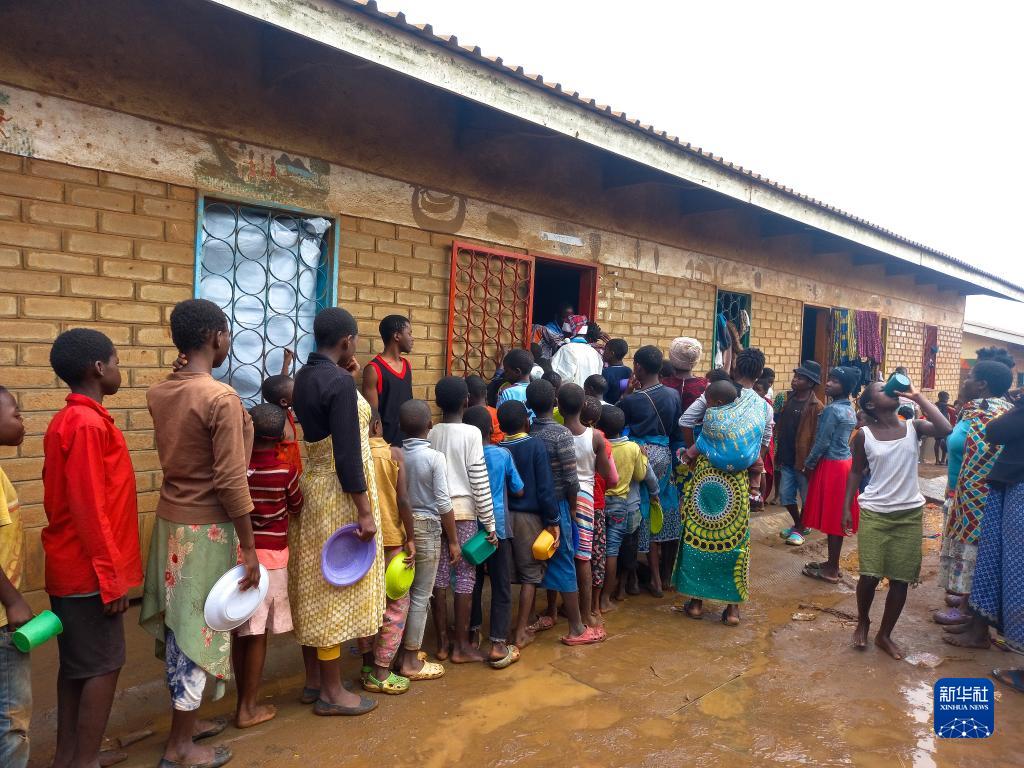 3月16日,在馬拉維布蘭太爾,一些災民兒童在一所小學內的臨時安置營地領取早餐。
