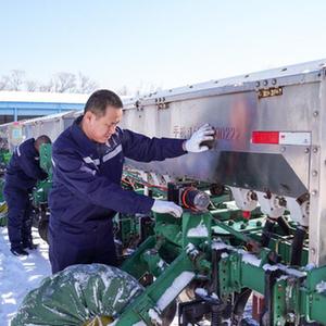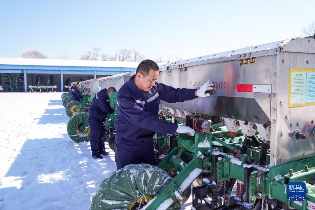 3月16日,在北大荒集團建設農場有限公司第四管理區,農機技術員在檢修農機具。