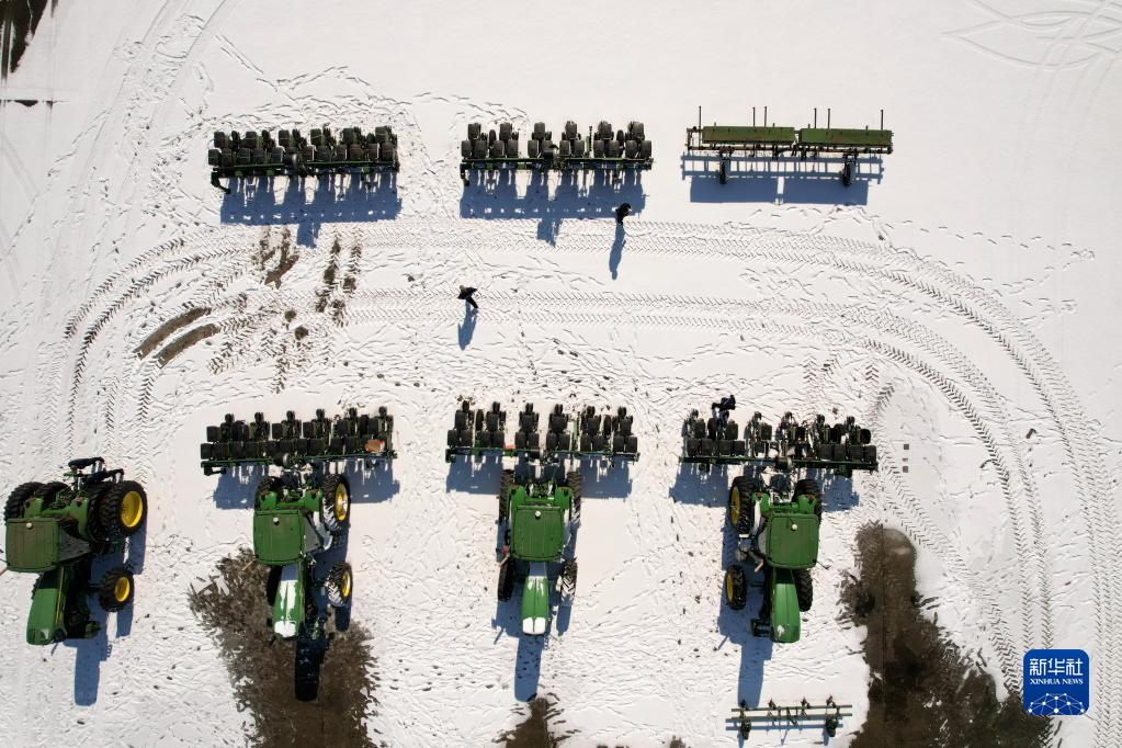 3月16日,在北大荒集團建設農場有限公司第四管理區,農機技術員在檢修農機具(無人機照片)。