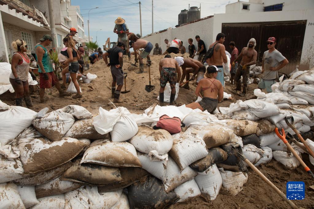 3月16日,人們在秘魯首都利馬南部的蓬塔赫爾莫薩地區建造臨時堤壩,以阻擋暴雨造成的泥石流。