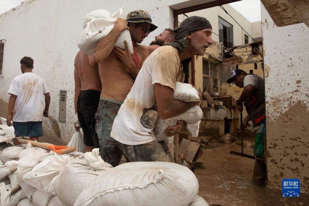 3月16日,人們在秘魯首都利馬南部的蓬塔赫爾莫薩地區建造臨時堤壩,以阻擋暴雨造成的泥石流。