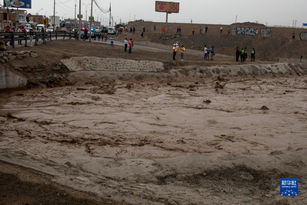 3月14日,人們在秘魯首都利馬南部的蓬塔赫爾莫薩地區查看泥石流災害情況。