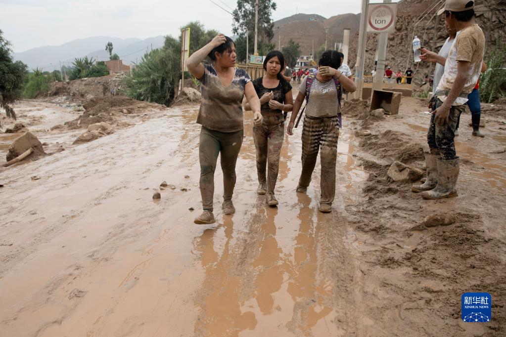 3月15日,在秘魯首都利馬南部的帕查卡馬克區,人們走在被泥漿覆蓋的街道上。