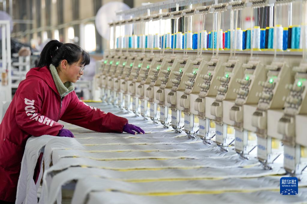 3月16日,河北省玉田縣窩洛沽鎮一家床墊制造企業的工人在生產線上工作。