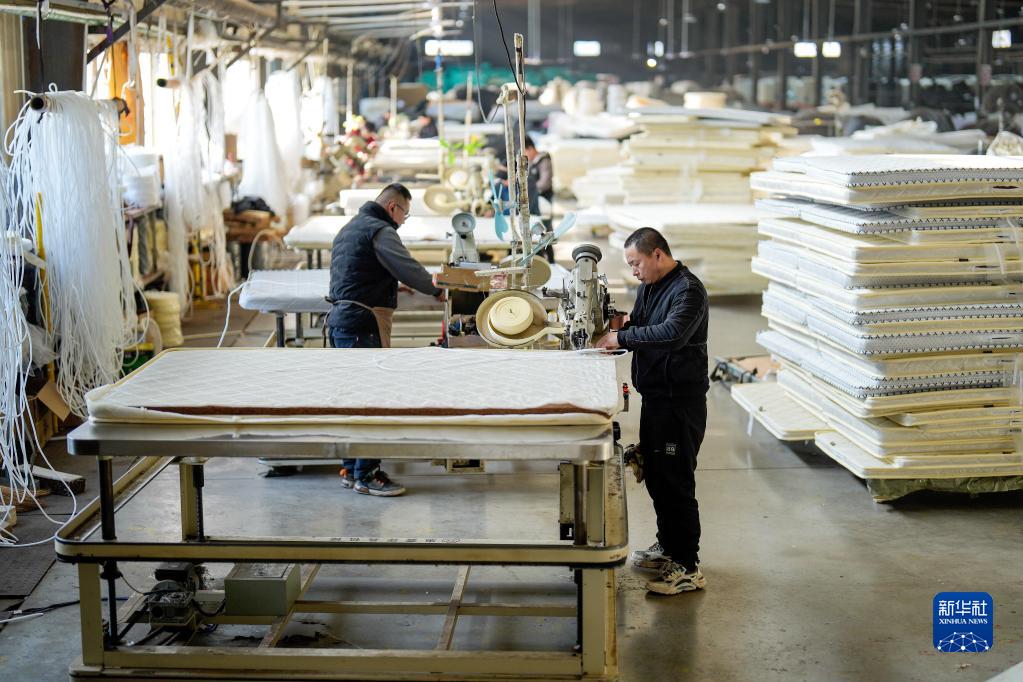 3月16日,河北省玉田縣窩洛沽鎮一家床墊制造企業的工人在加工床墊。