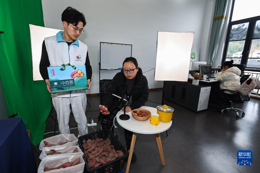 3月17日,在清涼峰鎮農創客中心,青年志愿者(左一)和農創客一起直播推廣當地農特產品。