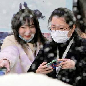 3月17日,參會者在2023哈爾濱冰雪博覽會上參觀飄雪機設備。