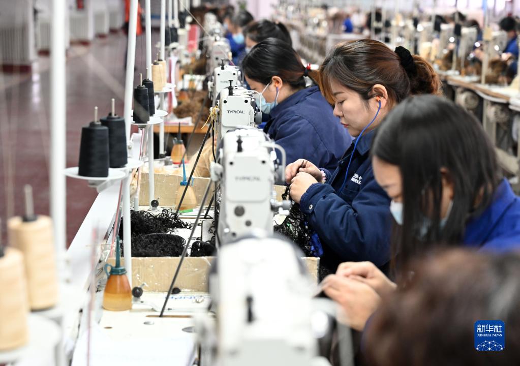 3月16日,工作人員在河南瑞貝卡發制品股份有限公司的生產車間里制作假發。
