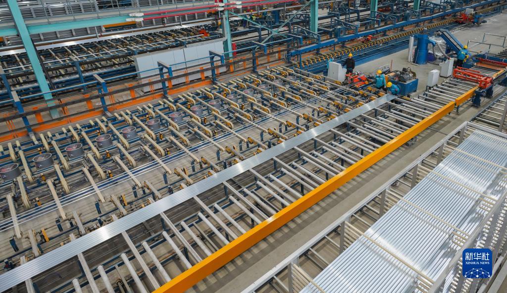 3月16日,山東省鄒平市禮德新能源科技有限公司工人在太陽能板鋁合金邊框擠壓生產線上生產(無人機照片)。