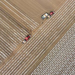 3月17日,灤南縣胡各莊鎮東梁各莊村的農民在田間使用農機播種馬鈴薯(無人機照片)。