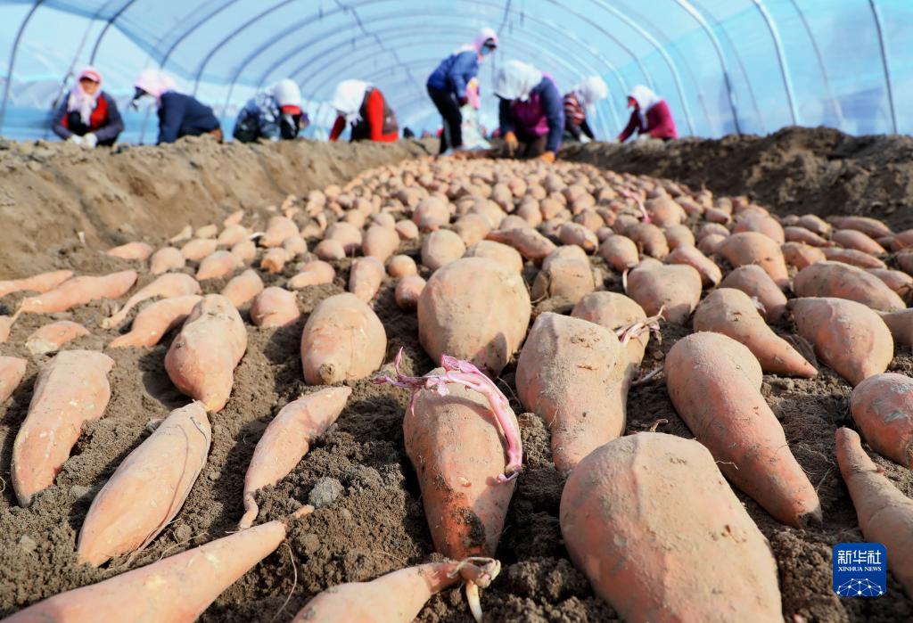 3月17日,灤南縣東黃坨鎮紅薯種植專業合作的社員在往育苗床上擺放紅薯種薯。