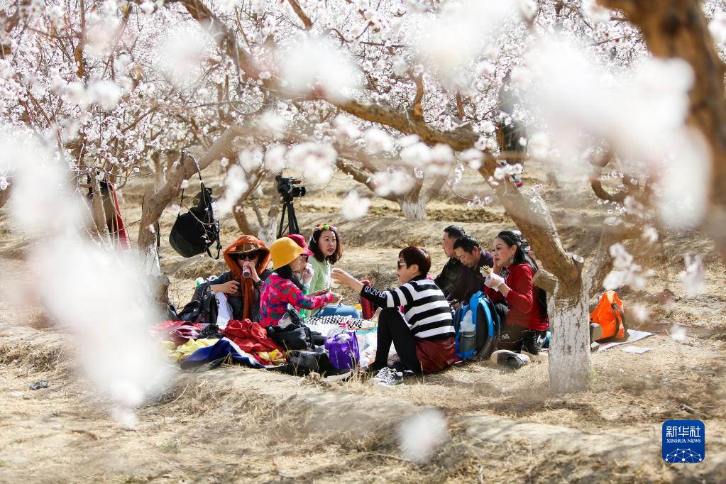 3月17日,游客在新疆吐魯番市托克遜縣夏鎮南湖村的杏林中游玩(無人機照片)。