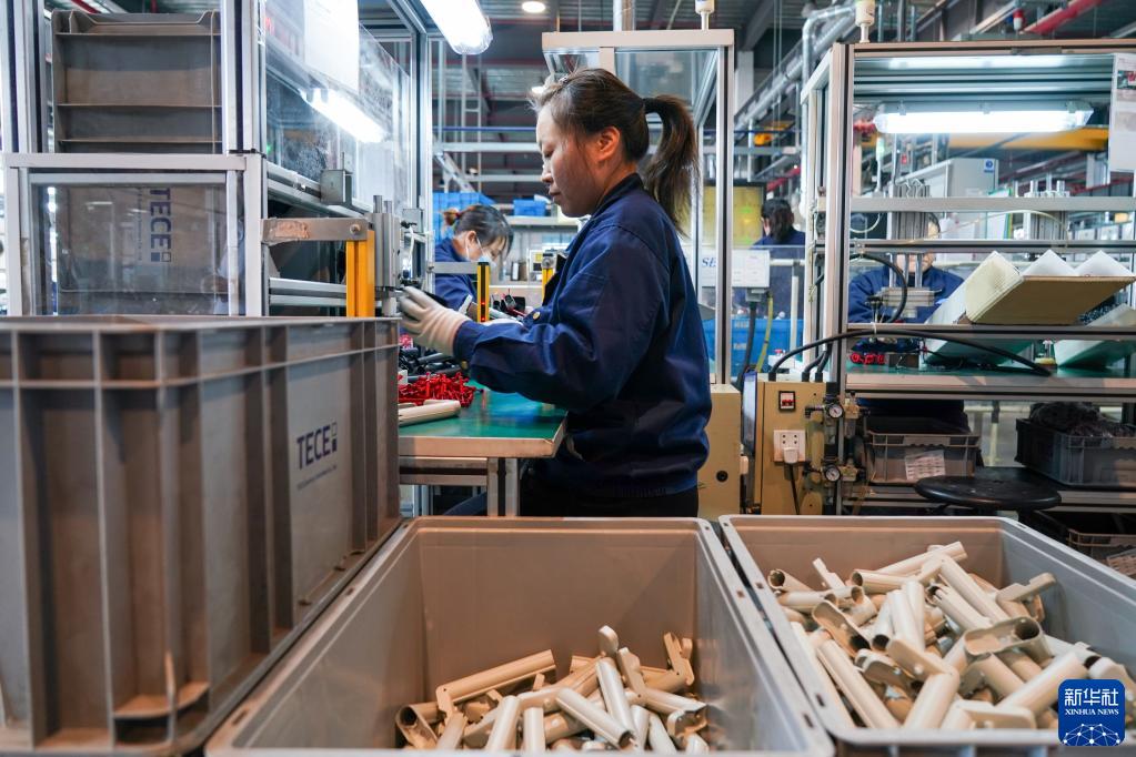 工人在位于太倉市高新區的帝希潔具系統(蘇州)有限公司生產車間內進行加工作業(3月16日攝)。