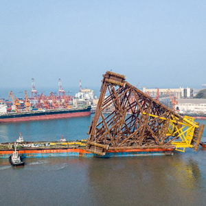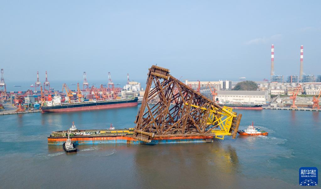 3月17日,在深圳赤灣海洋工程碼頭,“海洋石油228”運輸駁船搭載著恩平20-4平臺導管架啟航(無人機照片)。