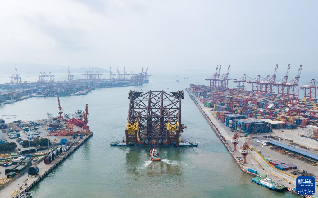 3月17日,在深圳赤灣海洋工程碼頭,“海洋石油228”運輸駁船搭載著恩平20-4平臺導管架啟航(無人機照片)。
