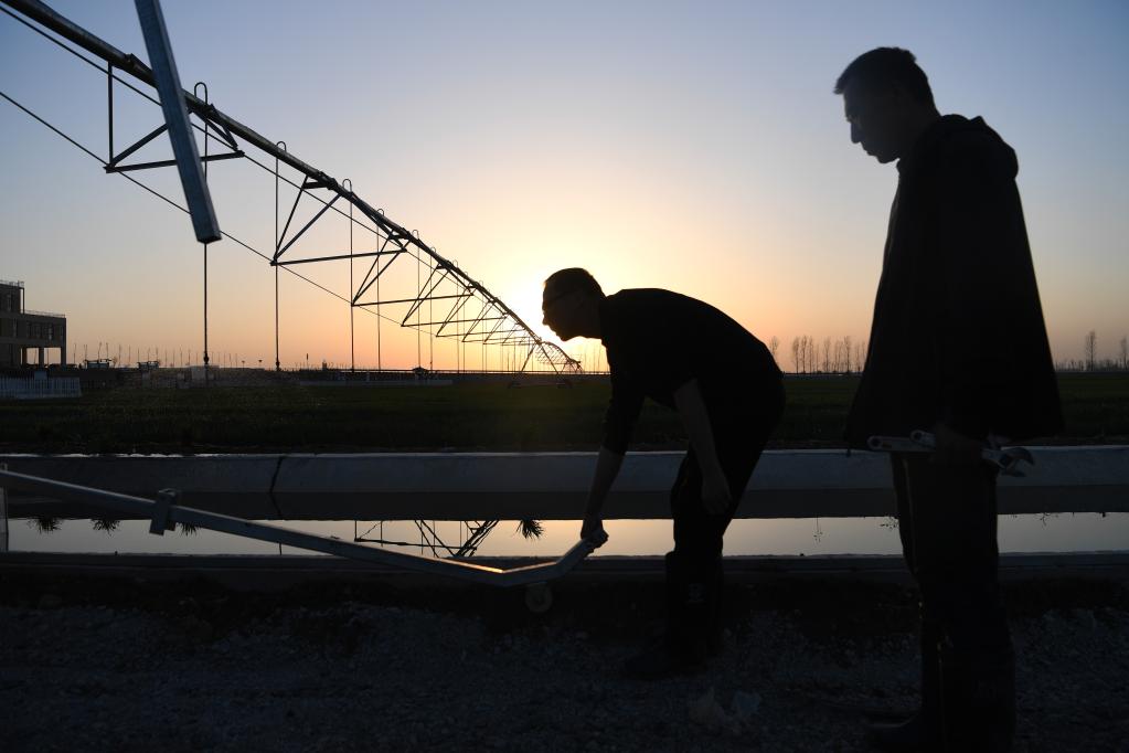 3月14日,在西平縣老王坡高標準農田示范區,劉亞輝(左)在調整噴灌機的移動方向。