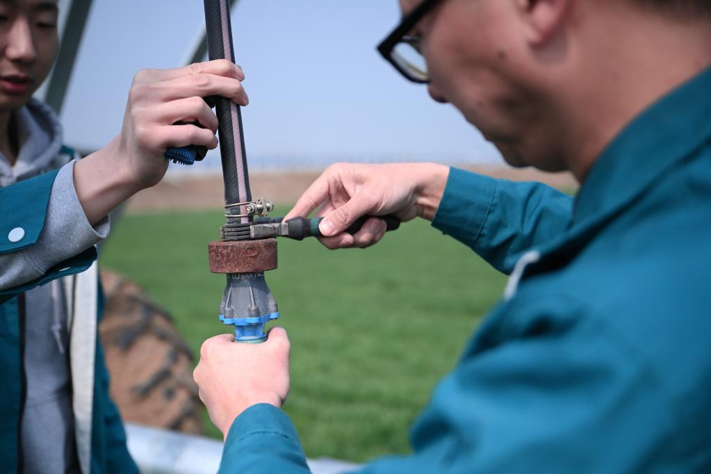 “這個噴頭換過了,你登記好?!痹诤幽鲜●v馬店市西平縣高標準農田示范區的麥田里,河南水投柏農產業發展有限公司運營管理部負責人劉亞輝一邊擰好噴灌機的新噴頭,一邊叮囑一起巡檢的王英凡。