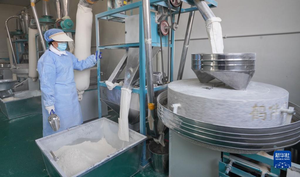 3月17日,在山東省鄒平市西董街道郭家峪村鶴伴磨坊,工作人員在生產石磨面粉。