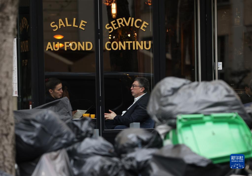 3月15日,人們在法國巴黎一家門口堆滿垃圾的餐館用餐。