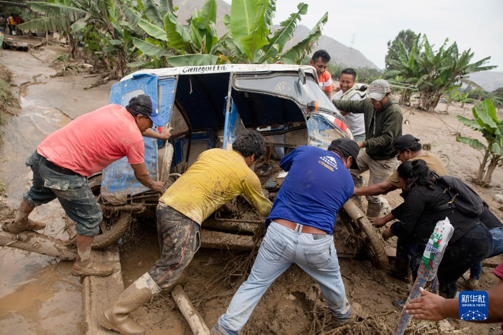 3月15日,在秘魯首都利馬南部的帕查卡馬克區,人們試圖將一輛車從淤泥中推出。