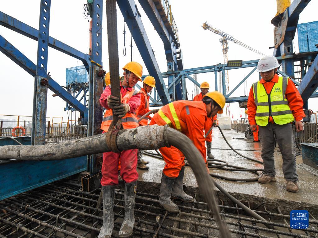 3月18日,在位于四川省瀘州市的渝昆高鐵瀘州沱江特大橋主跨合龍施工現場,施工人員在進行混凝土澆筑。