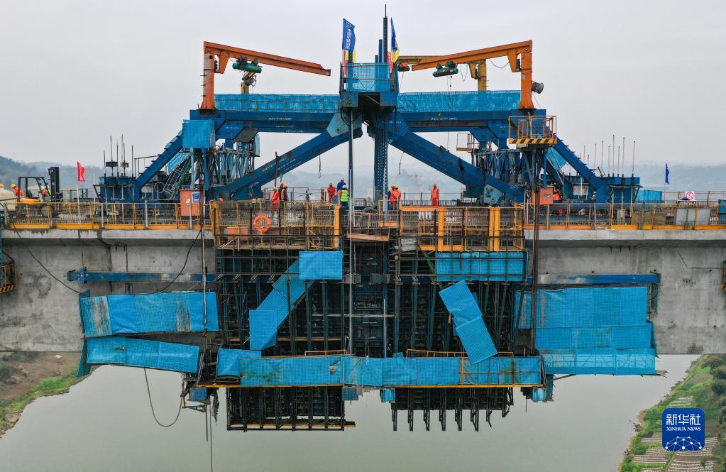 3月18日,施工人員在位于四川省瀘州市的渝昆高鐵瀘州沱江特大橋主跨合龍施工現場工作(無人機照片)。