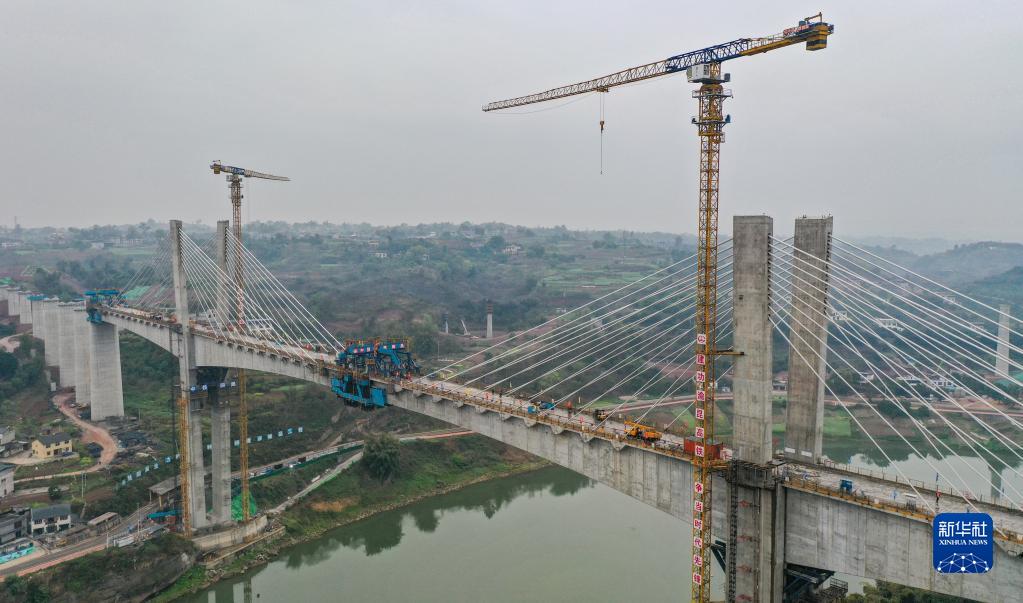 3月18日在四川省瀘州市拍攝的渝昆高鐵瀘州沱江特大橋主跨合龍施工現場(無人機照片)。